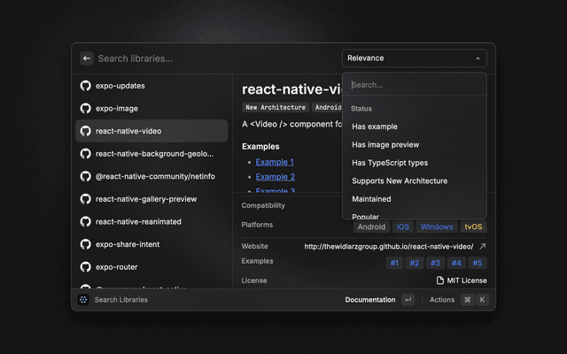 - Status (e.g., Supports New Architecture, Has examples, Has TypeScript types)
