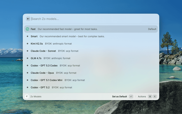 Chat with Zo models, manage defaults, and review activity