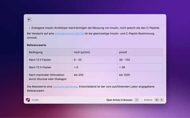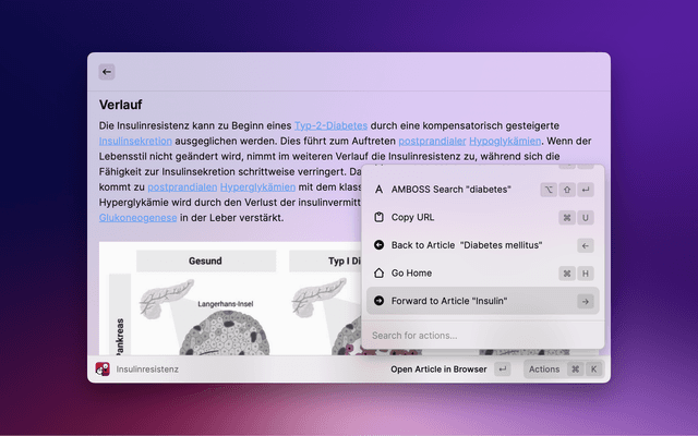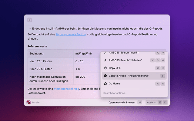 An (already existing) article can be opened directly in Raycast (⏎ or →), in the browser (via ⇧ + ⏎) or the title can be used as search text in the AMBOSS search (via ⌥ + ⏎). You can also copy the article URL directly to the clipboard (via ⌘ + C).