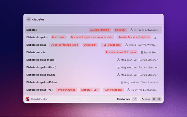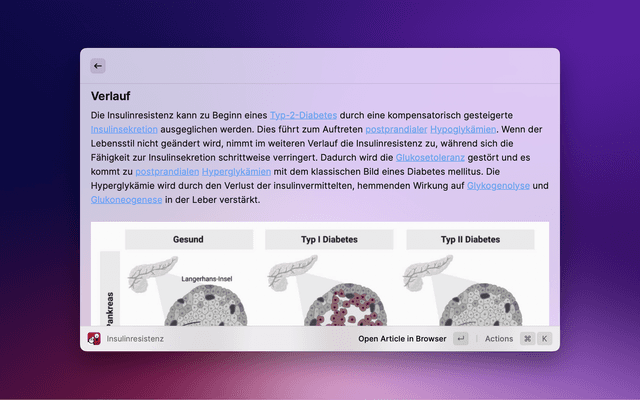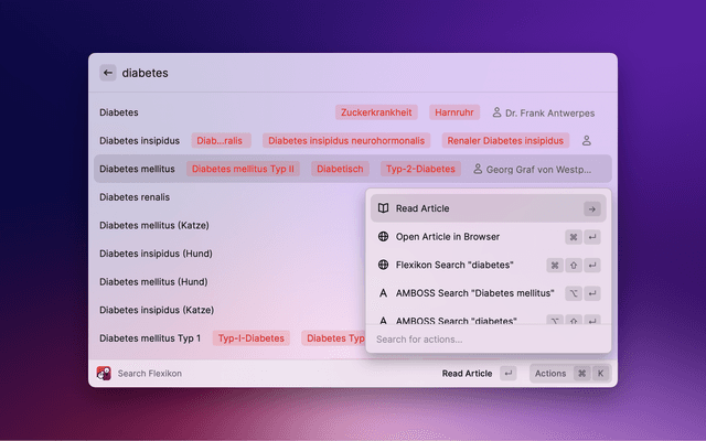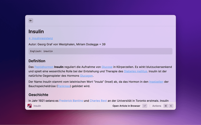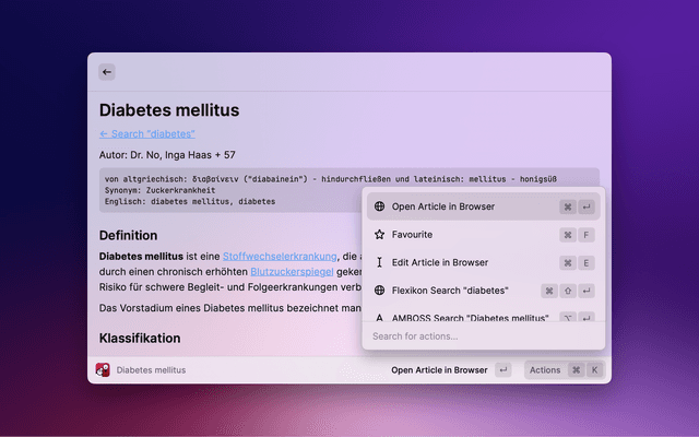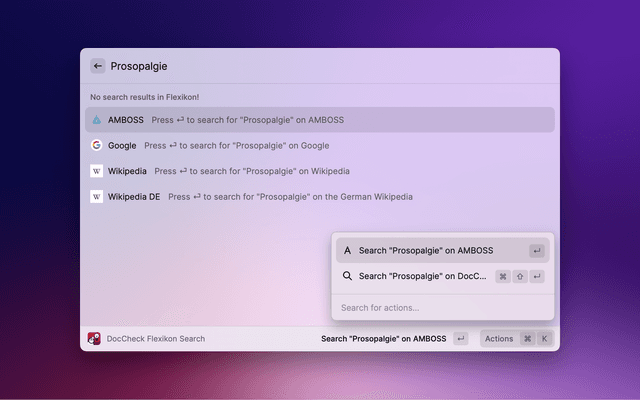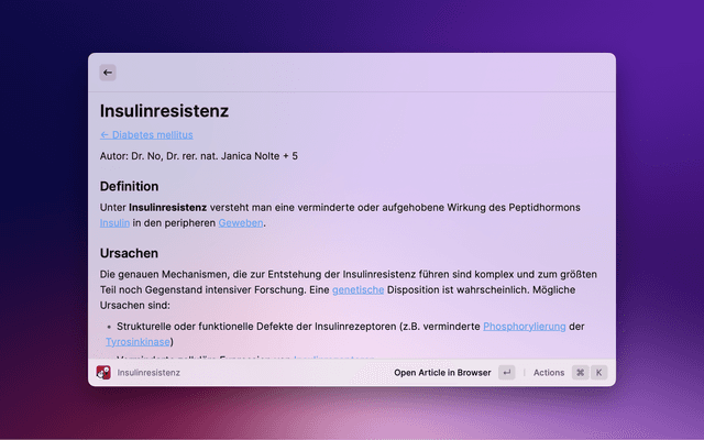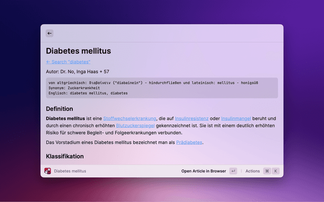 Search "DocCheck® Flexikon[, an open] encyclopaedia exclusively for the education and training of members and students of the medical profession (e.g. doctors, pharmacists, veterinarians, dentists) with Raycast. Please note that] this is not a guide to self-therapy and is not a substitute for medical advice or treatment." [Source: https://flexikon.doccheck.com/de/Flexikon:Wichtiger_Hinweis, last accessed 06.04.2023]