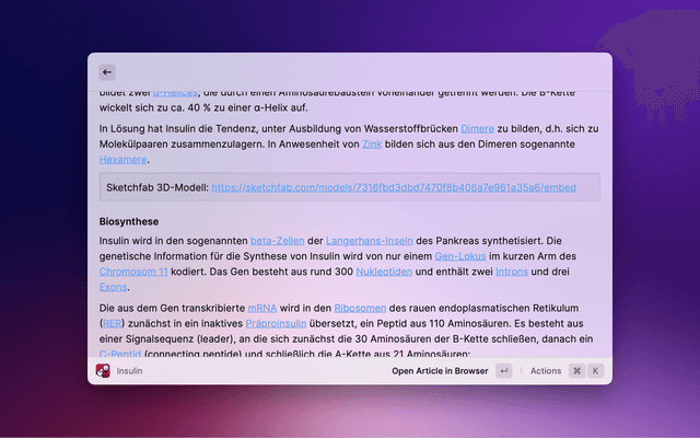 Once you have opened an article, you can press ⇧ with the above mentioned keys to search for the original search term entered (if you have opened the article from a search) and open the displayed article in edit mode in your browser (via ⌘ + E). If you click on a link, the following article will also open directly in Raycast by default (you can change this Navigate in to browser in settings), you can then go back and forth with the arrow keys (← or →) or (if you have clicked through some articles and do not want to press ← repeatedly) return to the home page with ⌘ + H.