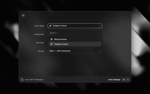 • Auto ASCII Wallpaper — Configure settings and apply a random ASCII wallpaper instantly.