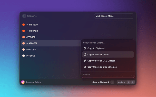 Raycast's Color Picker doesn't rely on complex commands - it's all about simplicity and speed. The primary commands are: