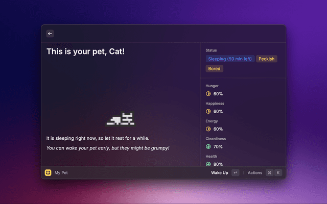A virtual pet in your Raycast menu bar. Feed, play with, and care for your virtual companion to keep it happy and healthy.