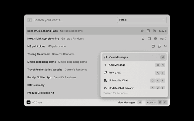 Interact with your v0 AI chats, from initiating new conversations to managing existing ones.