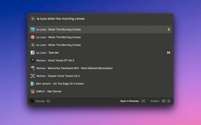This Raycast extension allows you to easily search the Discogs database for vinyl records.