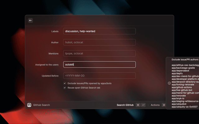 Open the GitHub Search web UI with pre-defined filters