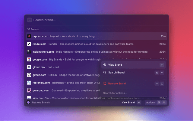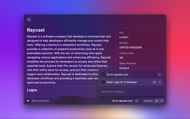 This is a Raycast extension to get a company's brand logos, colors, slogan, socials, and more via the Brand.dev API.