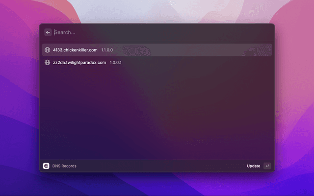 This is a Raycast extension for FreeDNS (https://freedns.afraid.org/). It uses the ASCII API (not XML) to fetch your records and allows you to change the associated addresses.