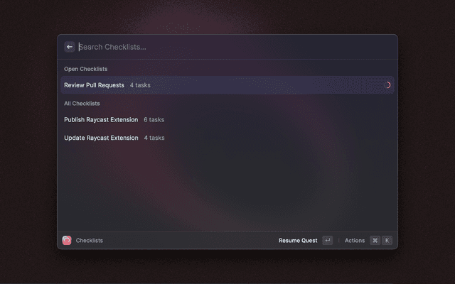 Checklist is a simple - Raycast native - app that allows you to create and work on checklists. Based on The Checklist Manifesto you know checklists can save lives and make you more productive by improving the quality of repetitive tasks. Checklist lets you create, edit and delete checklists. You can easily start working on them and keep track of the progress.
